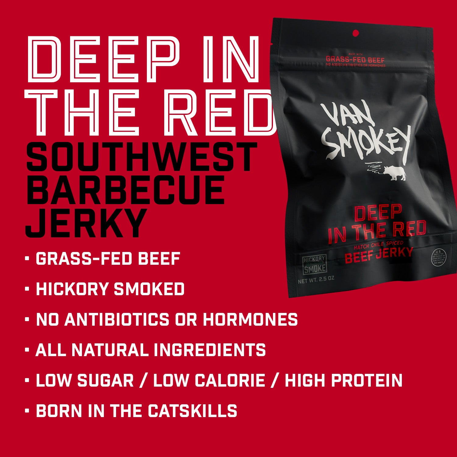 Healthy snack using the finest ingredients - Our Van Smokey Deep In The Red Beef Jerky is a delicious, grass-fed, protein-packed snack. We only use the highest quality beef and blend southwest BBQ flavors with some spicy Hatch chile from New Mexico to give it an extra kick. Plus, no antibiotics or hormones are used here!